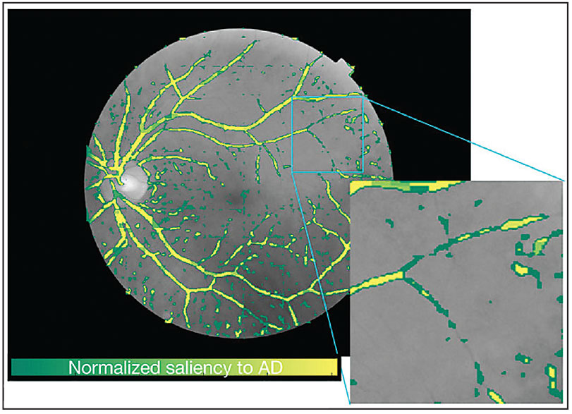 | Figure 2. Generated saliency map of a fundus photograph after the use of artificial intelligence for the detection of Alzheimer’s disease in a patient.17 A general observation that researchers can make through the saliency map is that small vessels contribute more than major vessels to Alzheimer's disease classification. Green pixels are more salient for classifying Alzheimer’s disease while yellow pixels don’t significantly contribute to this classification. According to this saliency map, small vessels and capillary vessels are more important in determining whether this image belongs to an Alzheimer’s disease subject. (Image used under creative commons license. Source: Science Reports) |