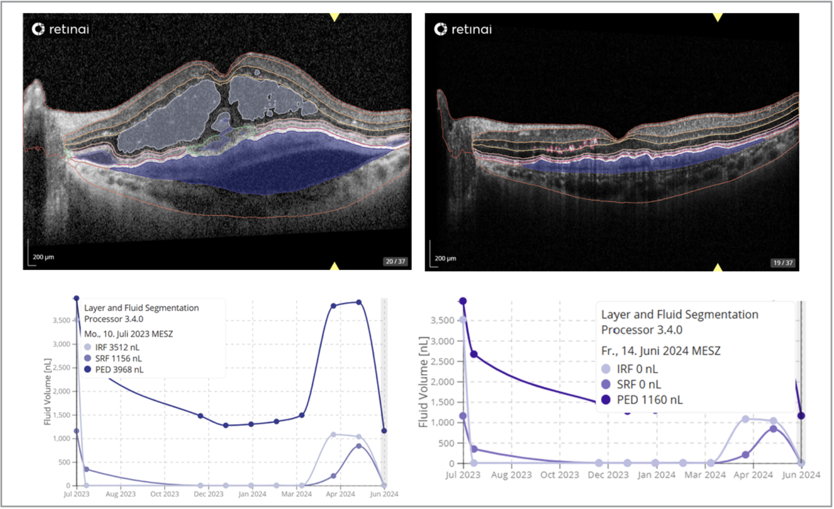 First and foremost, complex treatment regimens (e.g., SRF-tolerant protocols) require analyzing fluid stability over time, including precise measurement of its volume and/or height—metrics that, in practice, can only be reliably obtained with AI-assisted analytics. However, clinical evidence comparing AI-based approaches to current standards of care remains limited, which may explain the slow adoption of AI in routine practice. A large volume of intraretinal or subretinal fluid is typically considered a sign of disease activity, while complete absence of fluid usually supports a decision of inactivity. However, intermediate volumes—often in the range of just a few nanoliters—don’t always translate directly into activity assessments by the treating specialist. This illustrates why precise quantification through AI may help standardize interpretation and reduce subjectivity in clinical decision-making.