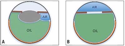 If oil is inadvertently overfilled, the oil-air interface will migrate into the anterior chamber and overfill is easy to identify. Extruding this excess oil and simultaneously infusing air, which will rise through the oil to refill the anterior chamber, will similarly ensure a perfect fill. With an air-filled anterior chamber in aphakic individuals, overfill is also rare unless an incision in the anterior chamber allows air to escape. This is because the oil does not rise above the air, and overfill would lead to an immediately firm eye.