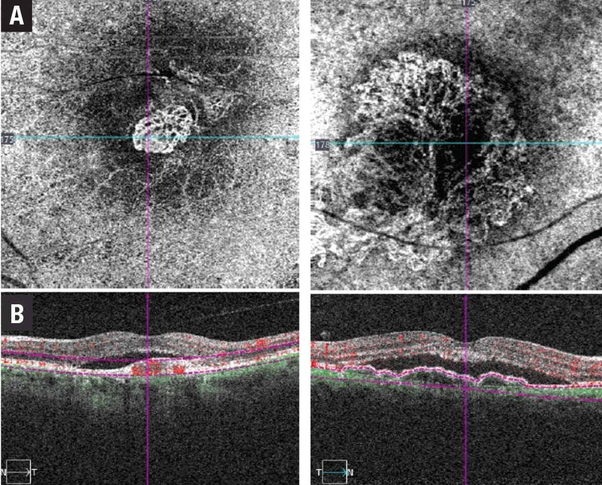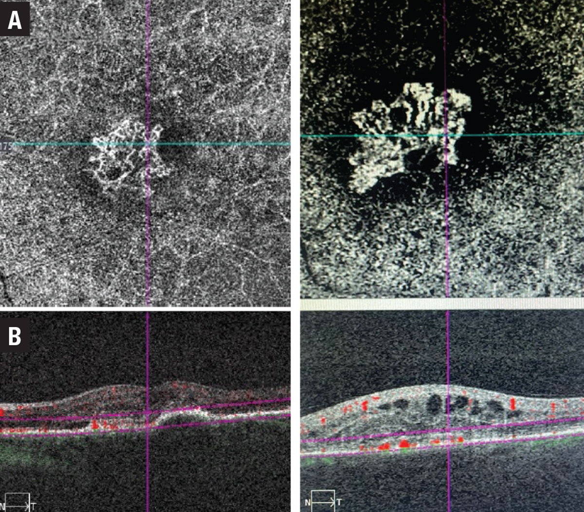 | Figure 2. Two examples of type 1 macular neovascular membrane: A) Optical coherence tomography angiography en-face scan; and B) B-scan flow overlay showing subretinal pigment epithelium neovascular membranes. |