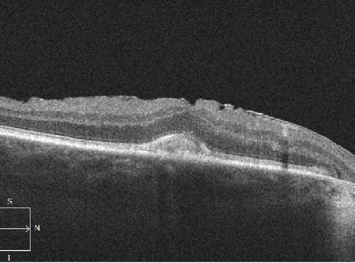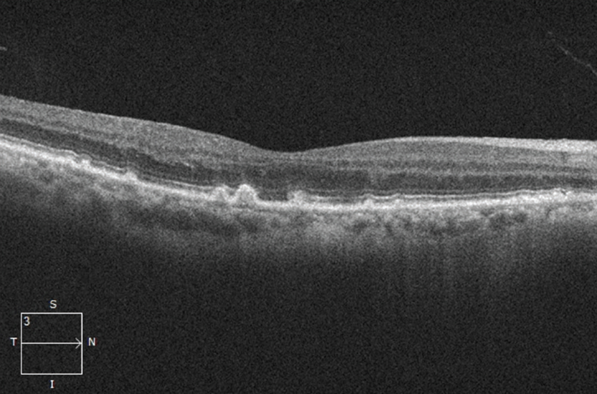 | Figure 1. Optical coherence tomography scan showing drusen (accumulation of deposits underneath the retinal pigment epithelium), a sign of dry age-related macular degeneration. |