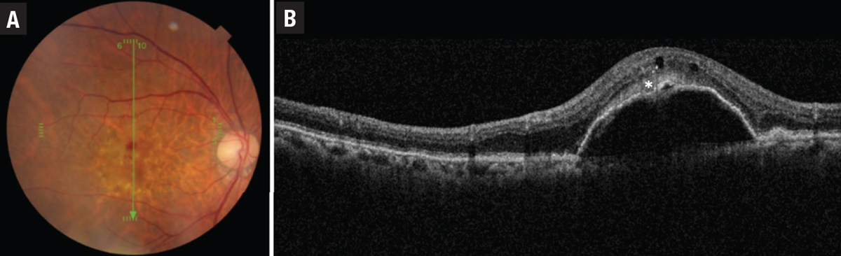 | Figure 4. An example of a type 3 macular neovascular membrane. A) Fundus photograph shows intraretinal hemorrhage and pseudodrusen. B) Corresponding optical coherence tomography B-scan shows serous pigment epithelial detachment, intraretinal fluid and subretinal hyperreflective density (asterisk). |