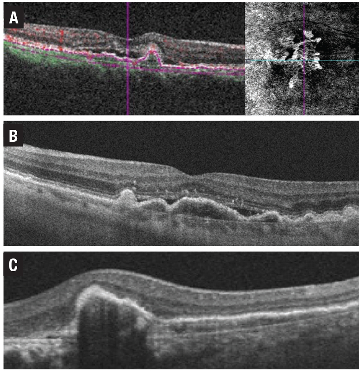 | Figure 6. A) Optical coherence tomography angiography B-scan with flow overlay (left) and en-face scan (right) show a vascularized pigment epithelial detachment. B) Shallow irregular retinal pigment epithelium elevation (SIRE). C) Fibrovascular PED with banding. |