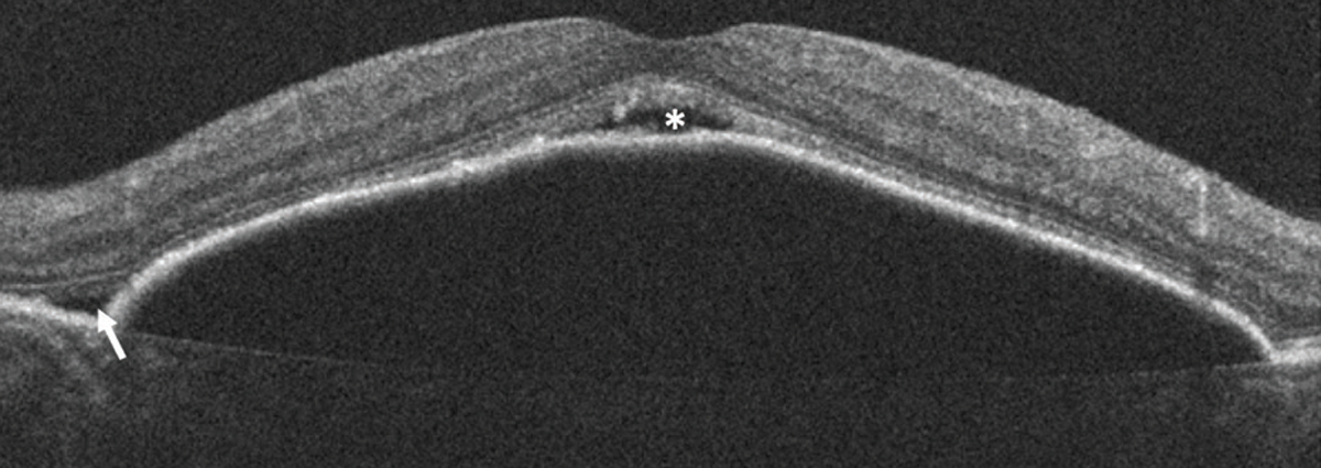| Figure 8. Optical coherence tomography of a large pigment epithelial detachment associated with subretinal fluid at the edge (arrow) and vertex (asterisk) of the PED. |