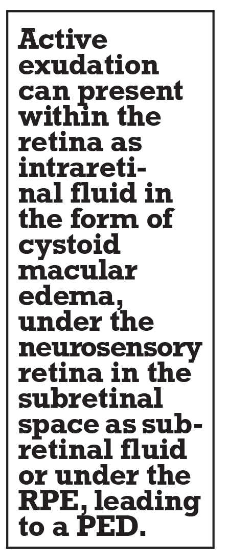 Active exudation in AMD can present within the retina as intraretinal fluid in the form of cystoid macular edema, under the neurosensory retina in the subretinal space as subretinal fluid or under the RPE, leading to a PED. Vascular endothelial growth factor mediates IRF and SRF in nAMD, so it should respond to treatment with anti-VEGF injections. However, fluid in the setting of AMD can occur in other contexts.