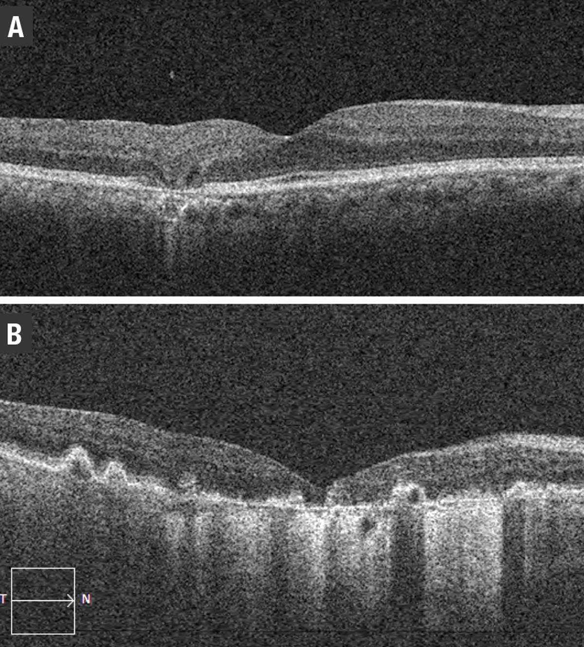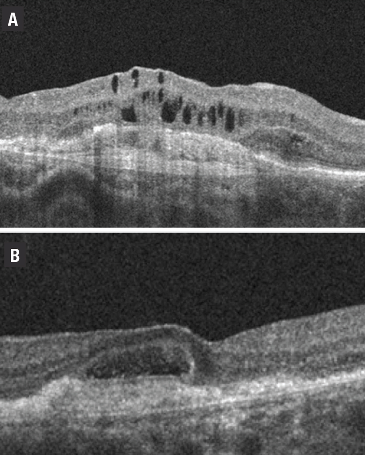 | Figure 9. Optical coherence tomography shows: A) degenerative intraretinal cystoid lesions overlying a disciform scar; and B) outer retinal tubulation. |