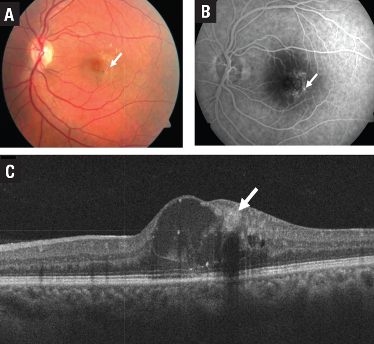 | Figure 11. Multimodal imaging of perifoveal exudative vascular anomalous complex (PEVAC) shows: A) an isolated aneurysm (arrow) temporal to the fovea; and B) confirmatory fundus fluorescein angiography. C) Optical coherence tomography shows the aneurysm with a hyperreflective wall and hyporeflective lumen. |