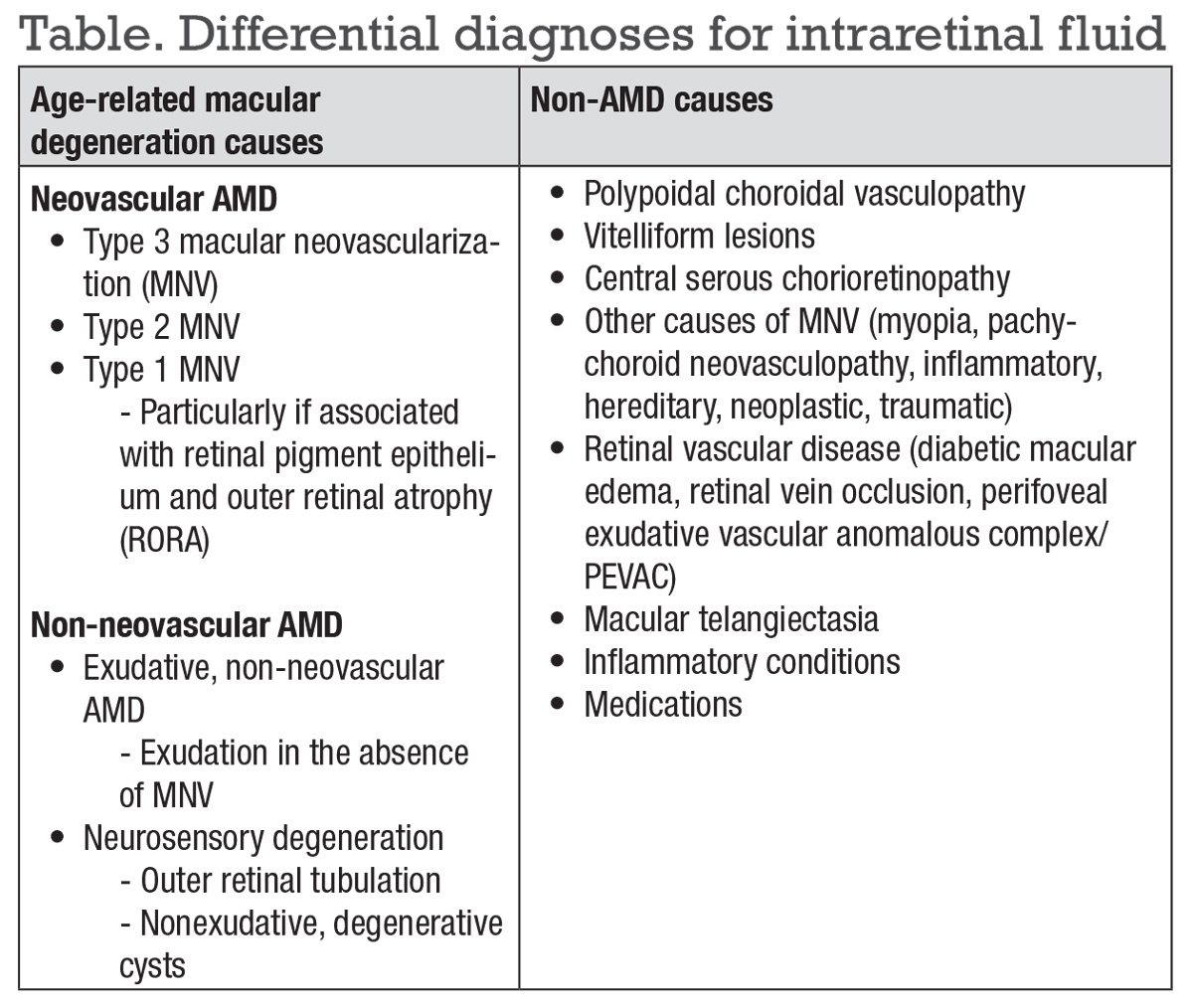 IRF is another location in which fluid in the setting of AMD can occur. IRF typically occurs from intraretinal neovascularization, or intraretinal migration of fluid originating from subretinal or sub-RPE neovascular lesions, with disruption of the outer retinal layers. This contrasts with macular edema in diabetic retinopathy or retinal vein occlusion, in which VEGF-mediated hyperpermeability of endothelial cells leads to IRF.11