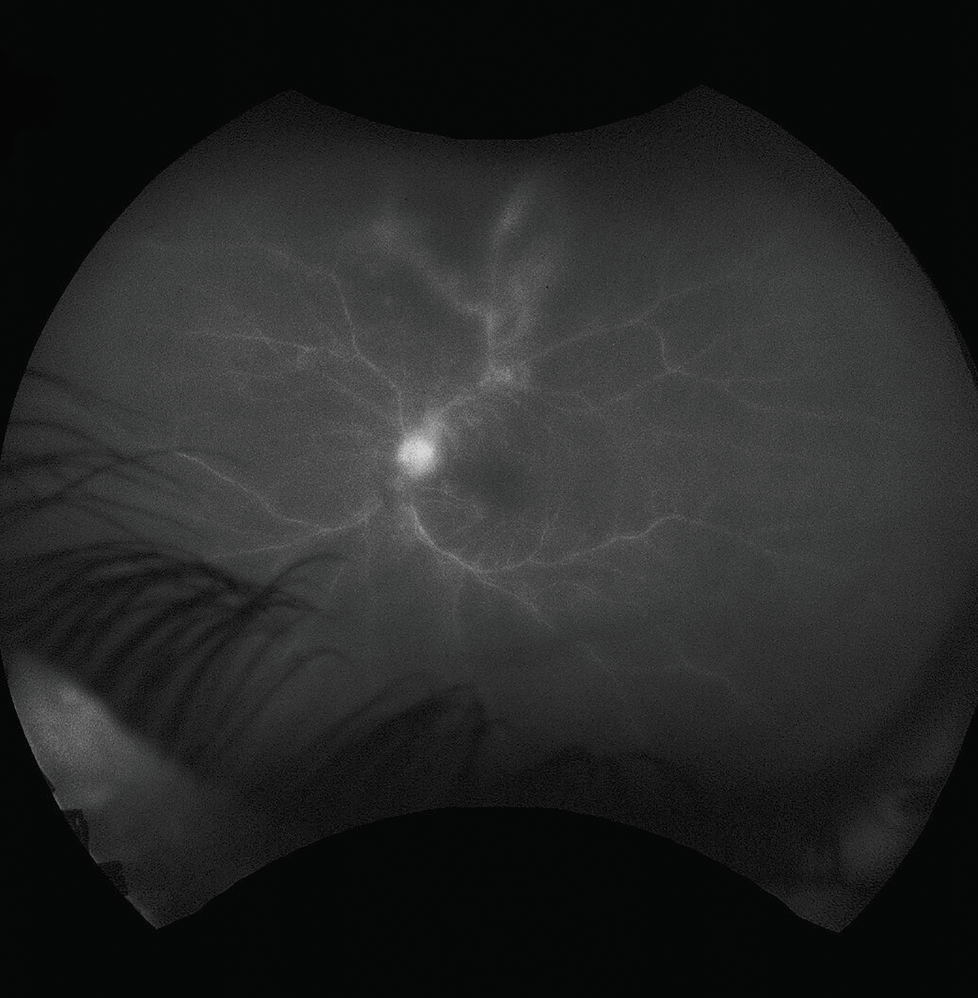 Dilated fundus exam of the right eye was normal. The dilated fundus exam of the left eye was notable for 2+ cells with 3+ vitreous haze. The nerve appeared flat with no frank disc edema. There was difficulty visualizing the retinal vessels and the macula. A large patch of retinal whitening, at least greater than three disc diameters in size, just sparing the macula was present. Abutting the inferior arcades were multiple white satellite lesions (Figure 1).