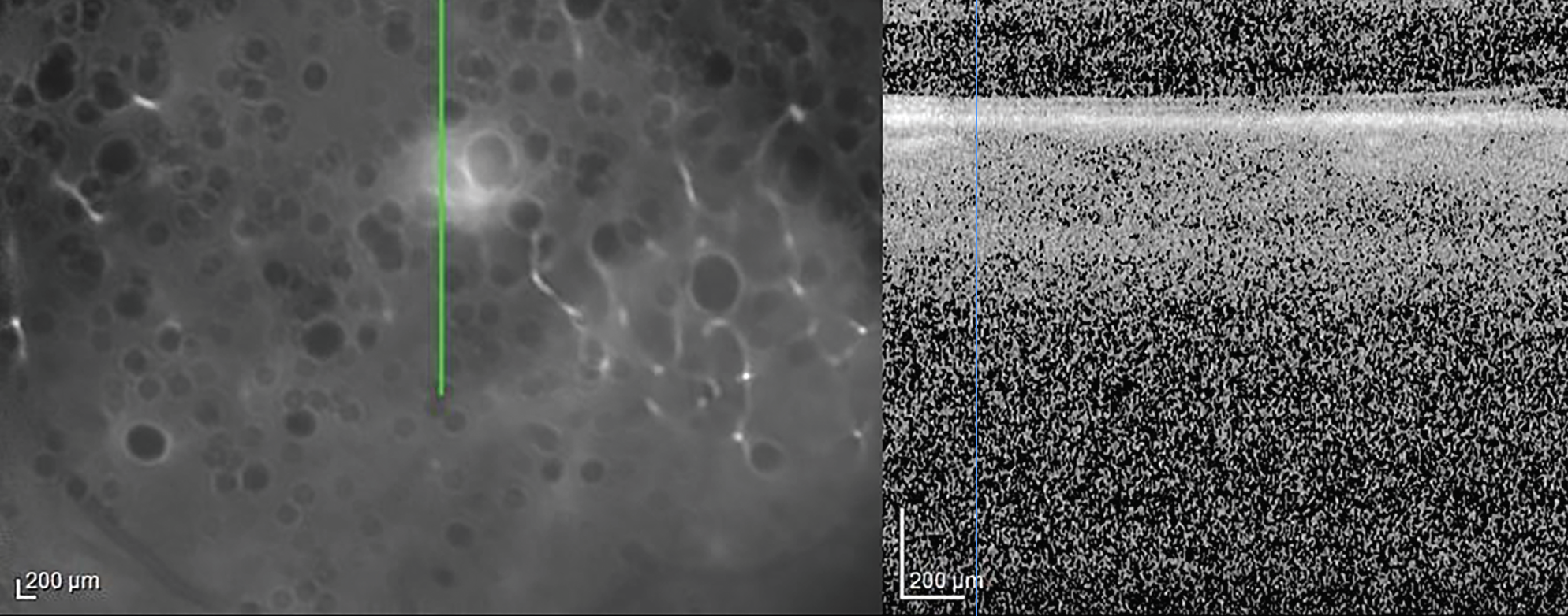Fluorescein angiography of the right eye was relatively unremarkable. Fluorescein angiography of the left eye revealed early blockage and late staining of the area of retinitis with peripheral vascular leakage (Figure 2). Optical coherence tomography of the right eye revealed a clear hyaloid, intact retinal laminations and a normal choroid. OCT of the left eye was of poor signal owing to the dense vitritis, however, there did appear to be vitreous cell with a hyper-reflective foci overlying the internal limiting membrane (Figure 3). Grossly, the retinal laminations appeared to be intact with no frank evidence of intraretinal or subretinal fluid.