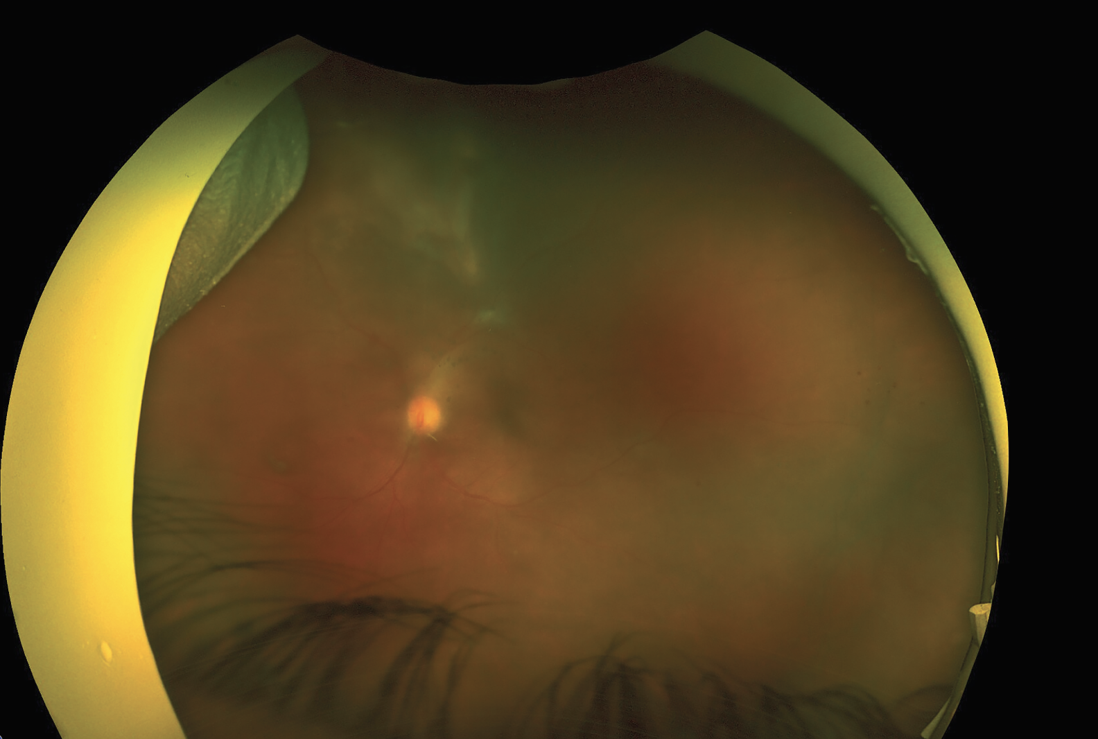 | Figure 4. Follow-up ultra-widefield fundus photo of the left eye one week after initiating systemic Bactrim DS. There’s improvement in vitreous haze (1-2+), resolution of the satellite lesions and regression of the main superior lesion with borders now more clearly defined than in the prior fundus photo. |