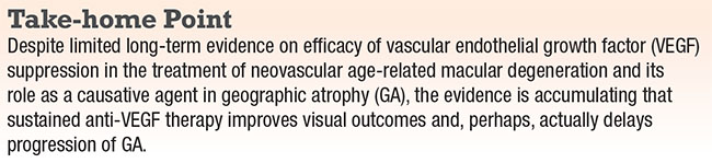Despite the increased prevalence of atrophy in patients receiving more sustained VEGF suppression, we cannot infer a direct causation. A recent study by Miho Tanaka, MD, and colleagues demonstrated that after 3.5 years, GA did not tend to occur outside the boundaries of the initial choroidal neovascularization (CNV) unless the eyes had GA outside this area at baseline.18 Subsequent analysis of the CATT study data also seemed to refute a direct causation between increased VEGF suppression and GA.