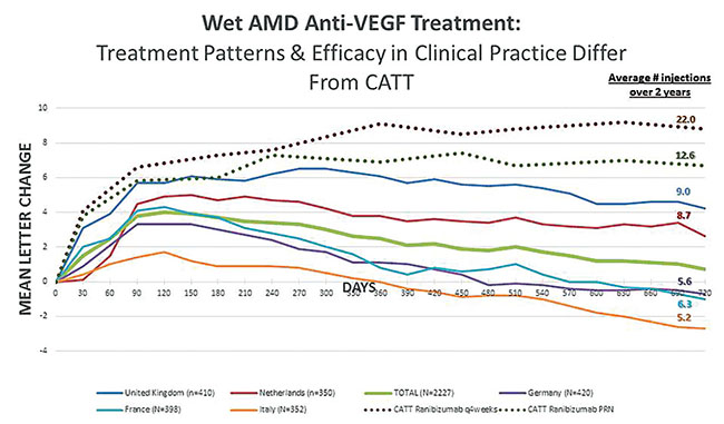 While the aforementioned studies have been crucial in guiding our management and treatment of exudative AMD, the treatment protocols can be onerous to adhere to in clinical practice. Many retinal physicians gravitate toward less-frequent examination and dosing regimens. Frank Holz, MD, and colleagues demonstrated that this has resulted in poorer visual outcomes in “real-world” clinical scenarios compared to published study results (Figure 1).9