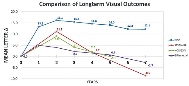 CATT showed that visual gains of PRN dosing with bevacizumab were inferior to those with monthly ranibizumab after the first year. These discrepancies over time raised the question of whether additional temporal divergences might occur over the long term. Given the expense of large, randomized trials, treatment data has essentially been limited to two-year outcomes with a few exceptions mentioned herein. Only recently, with data from HORIZON, SEVEN-UP, FIDO, CATT and the observational study by Mark Gillies, MD, and colleagues, have we seen that a divergence in visual acuity outcomes between the various treatment regimens does indeed play out with time (Figure 2, Table).11-15