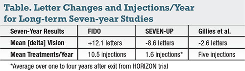 An additional cohort from HORIZON was further evaluated in the SEVEN-UP study that added three years of follow-up of patients exiting HORIZON after four years of therapy.12 They experienced further vision loss, ending up 8.6 letters below baseline (Figure 2). However, eyes only received an average of 6.8 injections over the 3.4 years after exit from HORIZON. Most notably, approximately 41 percent of eyes received no treatment at all.