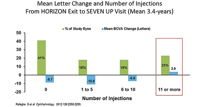 Eyes received six injections on average in the first year, five injections between years two and five, and 5.5 injections in years six and seven. While this study did not report a percentage breakdown of the various treatment regimens, the authors did state that the majority of investigators favored a treat-and-extend approach—consistent with a higher average number of injections than the SEVEN-UP study. More injections, however, were also associated with improved visual outcomes when compared to SEVEN-UP.