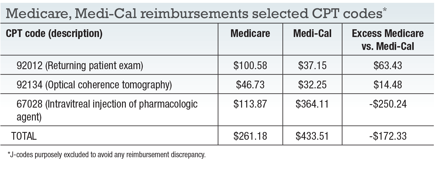 I selected these codes as common examples of typical office visits for a returning injection patient. Although the Medi-Cal rates are significantly lower for both the office visit and optical coherence tomography code, the very high injection code reimbursement more than compensates for the loss on the other two codes.
