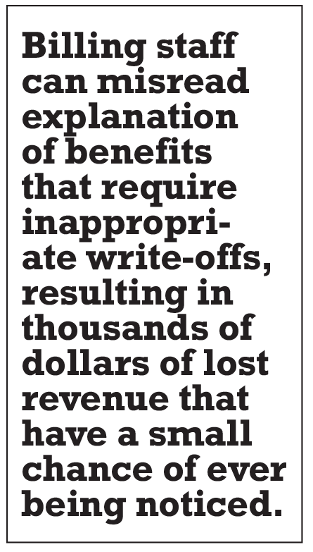 Billing staff can misread explanation of benefits (EOBs) that require inappropriate write-offs, resulting in thousands of dollars of lost revenue that have a small chance of ever being noticed. If offices are using an auto-post software (which most do), checking the reports after the computer automatically posts the EOB is crucial. The computer will do exactly what the EOB states and erroneous write-offs occur consistently. This, too, is part of the contract process.