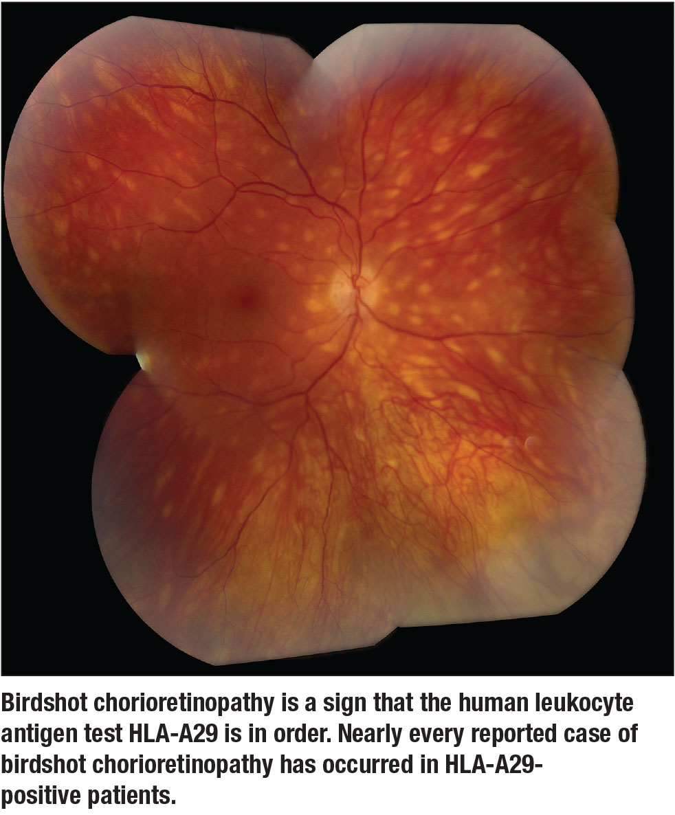 The only other human leukocyte antigen test that has any clinical value is HLA-A29 in the setting of birdshot chorioretinopathy (Figure) or an inflammatory/infiltrative choroidopathy with a similar phenotype. Nearly every reported case of birdshot chorioretinopathy has occurred in HLA-A29-positive patients. Some uveitis specialists don’t believe that seronegative (HLA-A29-negative) birdshot chorioretinopathy exists. A positive test in an individual with bilateral, yellow-orange ovoid choroidal spots essentially confirms the diagnosis, whereas a negative test may lead one to consider other diagnoses, such as lymphoma and sarcoidosis, both of which can closely mimic birdshot.