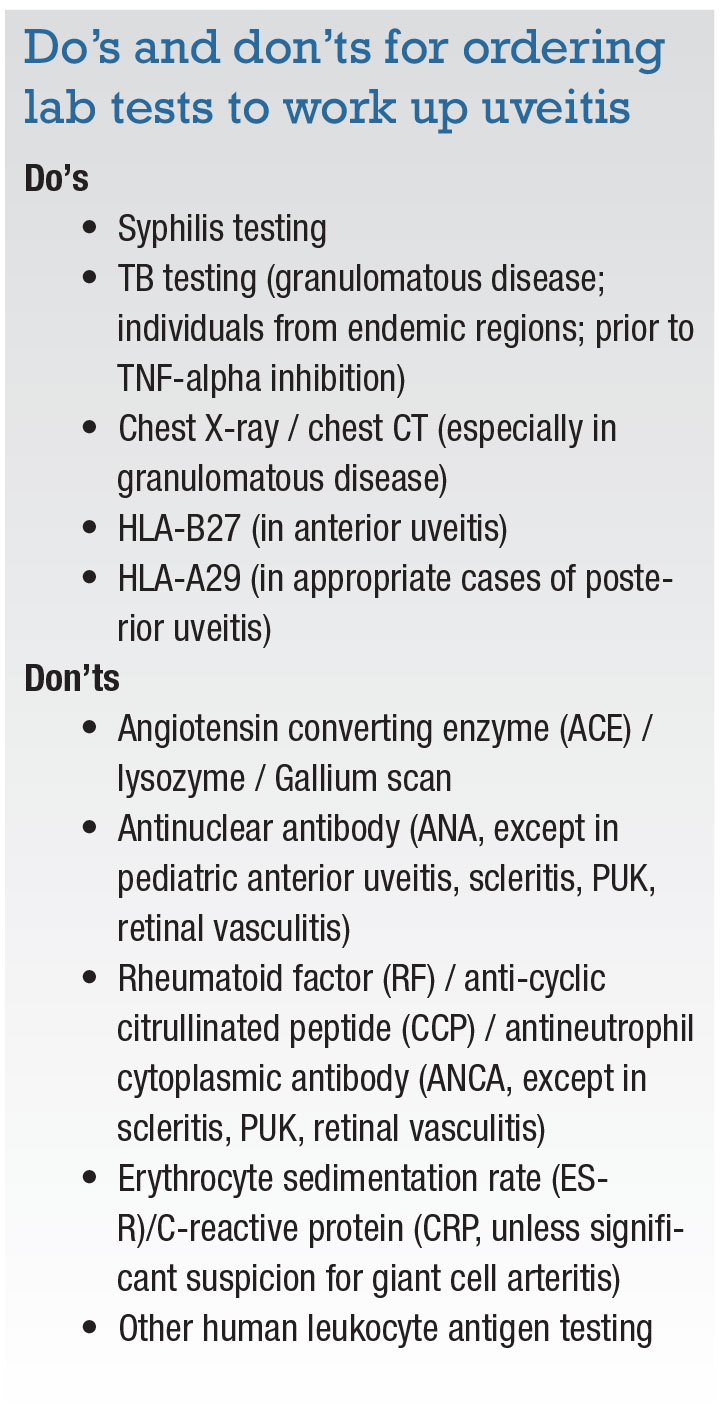 When in doubt, a quick e-mail or phone call to an accessible uveitis specialist can provide some valuable insight, especially if the individual initiating the workup is not uveitis fellowship-trained and/or uncomfortable making these types of decisions.