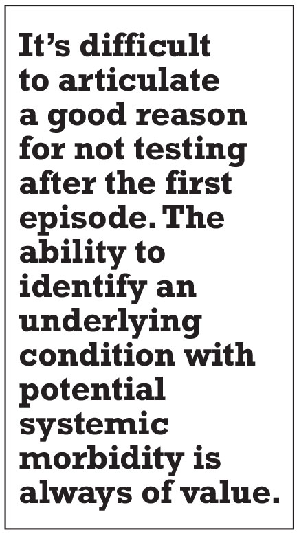 It’s difficult to articulate a good reason for not testing after the first episode. The ability to identify an underlying condition with potential systemic morbidity is always of value. Theoretically, it’s better to know early on about these types of scenarios than to allow an infectious or systemic process to declare itself over time.