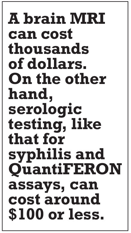 In calculating the associated costs, the study found that, not surprisingly, radiologic and ophthalmic imaging (not discussed in depth here) are among the most expensive tests ordered, comprising more than half of the testing costs when facility and professional fees are taken into account. A brain MRI, which can be invaluable in ruling out concomitant central nervous system disease in cases of intraocular lymphoma or demyelinating disease in individuals with intermediate uveitis, can cost thousands of dollars. On the other hand, serologic testing, like that for syphilis and QuantiFERON assays, cost around $100 or less. Therefore, we should seriously consider the clinical utility of testing, especially that of radiologic imaging, before sending an order.