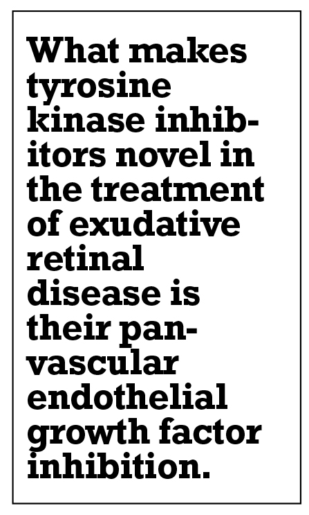 Tyrosine kinase inhibitors are drawing heightened interest as a novel treatment for exudative retinal disease. They include vorolanib (EYP-1901, EyePoint Pharmaceuticals), sunitinib (GB-102, Graybug Vision) and axitinib.