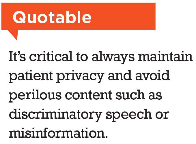Maintain your professional ethics online and err on the side of caution when posting content, whether images or videos. It’s critical to always maintain patient privacy and avoid perilous content such as discriminatory speech or misinformation. RS
