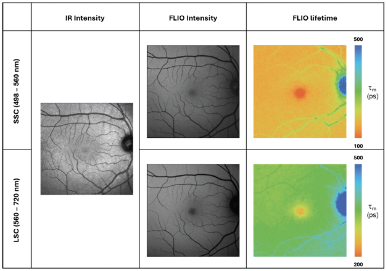 Beyond imaging fluorescence intensity, measurement of the time delay between fluorescence excitation and emission detection can provide insight into relative fluorescence contributions and the cellular environment. FLIO is a promising tool that compliments FAF.3 It’s a functional read-out that’s independent of the intensity of the fluorophore. Each fluorescent molecule (and states of molecules) has a unique decay time (“lifetime”) that depends on many factors and can vary with the wavelength of light used for excitation. When there are multiple molecules present, the overall measured lifetime reflects a relative combination of their individual lifetimes.