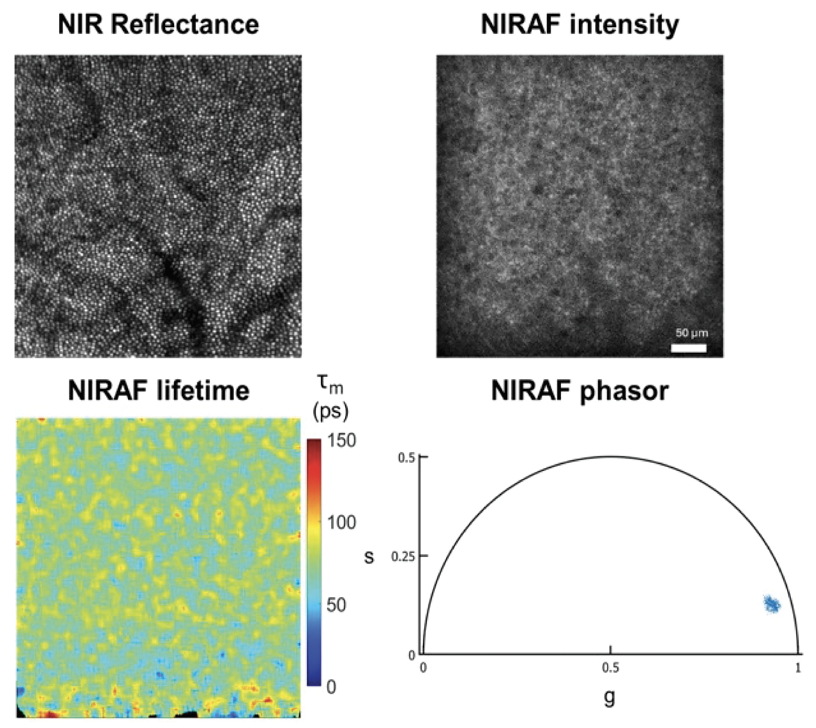 | Figure 2. AOFLIO image of the cone photoreceptors at 2 degrees temporal and the corresponding NIR autofluorescence (AF) intensity, mean lifetime and the phasor plot from the RPE in a 30-year-old healthy eye. |