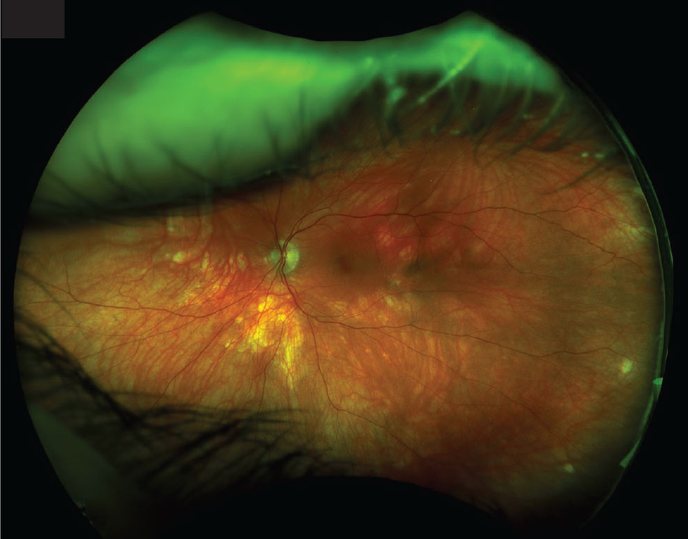 On exam, you can expect to find mild to no anterior chamber inflammation and no to moderate vitritis.8 Retinal vascular leakage may be the only noticeable finding early on, while the characteristic multifocal, cream-colored or yellow-orange, oval or round lesions emerge from around the optic nerve later in the disease course (Figure 1).