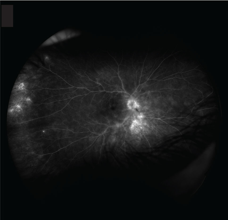 Figure 2. Fluorescein angiography demonstrates leakage of the retinal vessels and optic disc, along with angiographic macular edema. |