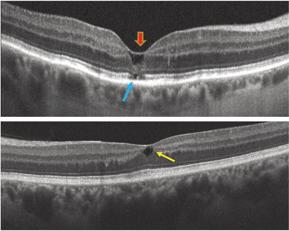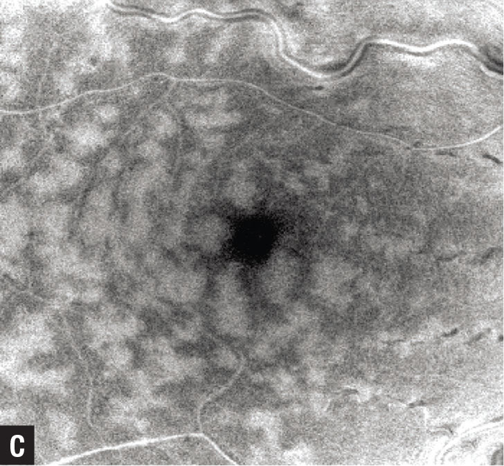 In MacTel type 2, OCT may show degenerative hyporeflective outer retinal cyst (or cavitation) located at various retinal depths along with asymmetry or irregularity of the fovea contour (Figure 3).13 Other findings include hyperreflectivity at the middle retinal layers, outward bending of inner retinal layers, retinal pigment clumps with shadowing of the deep retina, superficial retinal crystals, vitelliform lesion, internal limiting membrane drape and disruption of the external limiting membrane, ellipsoid and interdigitation zones.14-16