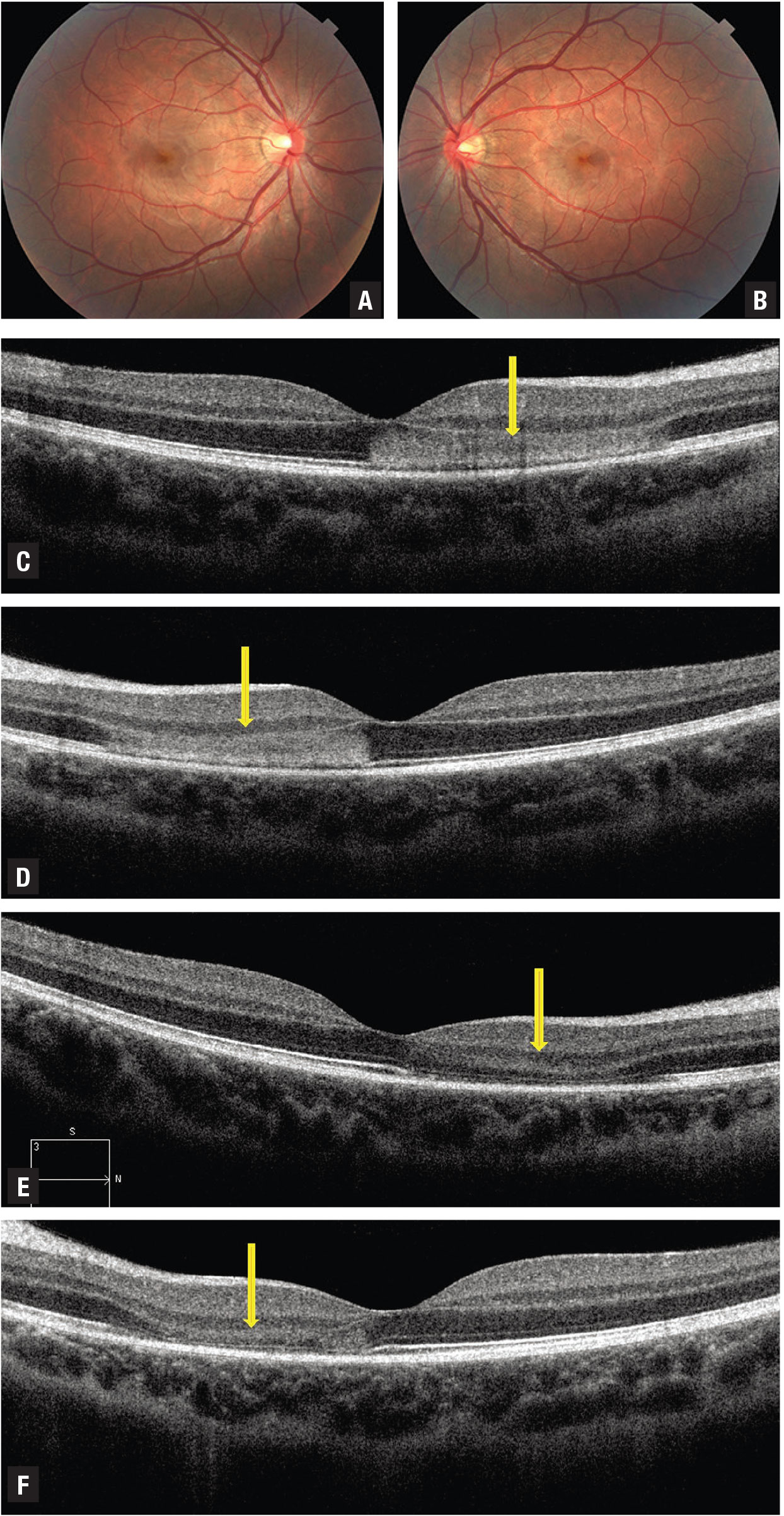 Figure 2. In acute macular neuroretinopathy, color fundus photography (A,B) reveals reddish-brown petaloid (n on elevated) perifoveal lesions with the tip pointed toward the fovea in a young woman presenting with bilateral scotomas. C,D) Spectral-domain optical coherence tomography (C right eye, D left) acutely through the lesion reveals a horizontal band of hyperreflectivity anterior to the retinal pigment epithelium between the outer plexiform and outer nuclear layers corresponding to the lesions. E,F) SD-OCT (E right eye, F left) two weeks after presentation shows disruption and loss of the ellipsoid and interdigitation zones corresponding to the acute lesions. |