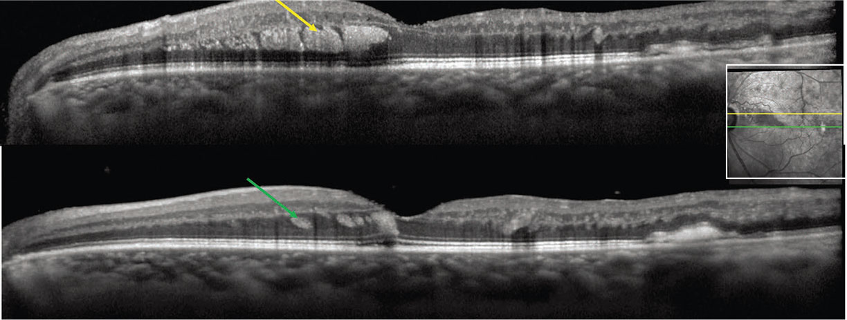 Figure 4. In Henle nerve fiber layer hemorrhage in a branch retinal vein occlusion, spectral-domain optical coherence tomography of the left eye shows oblique hyperreflectivity (yellow/green arrows) separated by hyporeflective striations corresponding to deep retinal hemorrhages in Henle fiber layer. The inset shows the near-infrared image. (Courtesy David Sarraf, MD) |