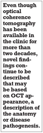 Even though OCT has been available in the clinic for more than two decades, novel findings continue to be described that may be based on OCT appearance, a description of the anatomy or disease pathogenesis. Table 1 describes a miniscule number of these novel findings from the recent literature. With careful observation, many of these findings can be observed and more novel OCT findings will be uncovered. RS