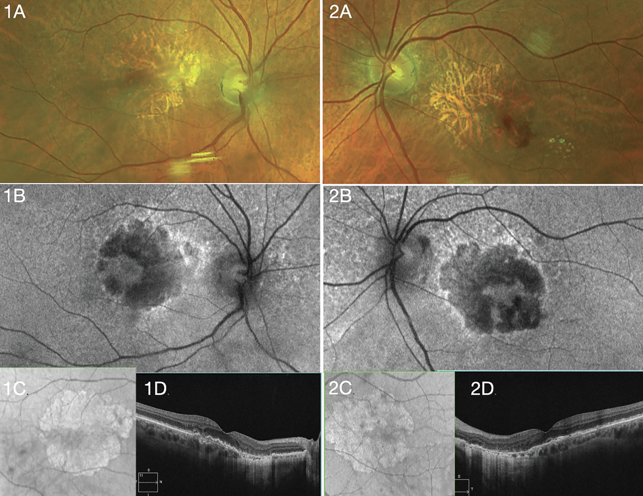 | A 72-year-old Caucasian woman with geographic atrophy in both eyes received treatment for neovascular age-related macular degeneration in the left eye. Vision is 20/20 OD and 20/25 OS. She's considering complement inhibition. Right (1A-D) and left (2A-D) eye show appearance of GA with fundus photos (A), fundus autofluorescence (B), near-infrared en face imag (C) and optical coherence tomography (D). |