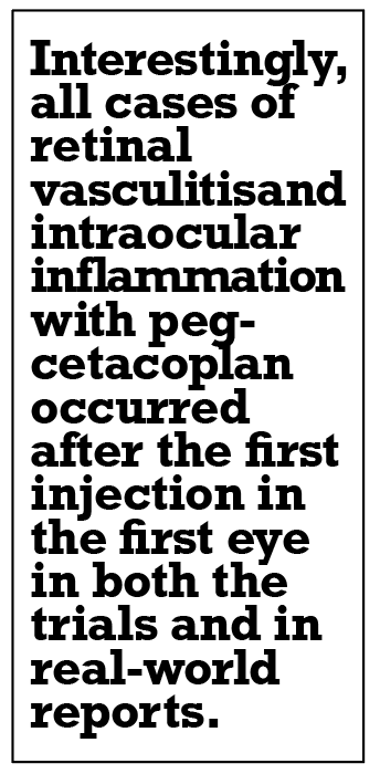 Intraocular inflammation. IOI rates were 4, 2 and <1 percent, respectively, for pegcetacoplan, and one case reported for ACP at two years. The clinical trials for both agents had no reports of retinal vasculitis or vascular occlusive events.1-3 Real-world cases of retinal vasculitis and intraocular inflammation have been reported at higher rates and severities than in the clinical trials. Of the 14 eyes of 13 patient cases in the postmarketing reports of retinal vasculitis after intravitreal pegcetacoplan, 57 percent of eyes had a 3-line decrease and 43 percent had a 6-line decrease in vision from baseline to final follow up. Two eyes were enucleated.