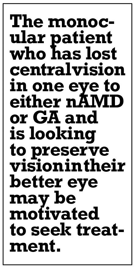 The monocular patient who has lost central vision in one eye to either nAMD or GA and is looking to preserve vision in their better eye may be motivated to seek treatment. Given that the inflammatory events occurred with the first injection in all reported cases thus far, one strategy might be to consider treating the worse-seeing eye first.