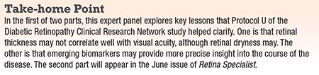 In this first of two parts, the panelists discuss what Protocol U reveals about appropriate treatment loads and the role of anatomic data in directing therapy. In the second part, to appear in the June issue of Retina Specialist, the panel will discuss specific strategies for using corticosteroids in the DME patient and how to manage side effects.
