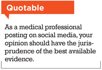 As a medical professional positing on social media, your opinion should have the jurisprudence of the best available evidence. Similarly, guide patients and your online audience to credible peer-reviewed websites. Social media is part of our voice and, as retina specialists and medical doctors, we have to continue to speak the truth with clear affect. RS