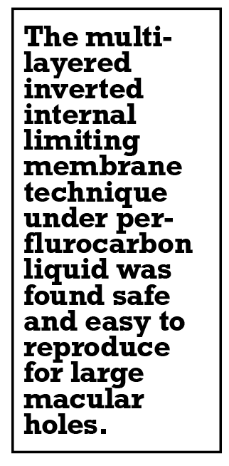 Vishal Agrawal, MD, a professor at SMS Medical College in Jaipur, India, reported on a hospital-based, prospective, randomized, interventional consecutive study of 150 eyes, with an even number assigned to either the ILM peeling group or vitrectomy with the ML-IILM technique.2 Patients were treatment-naive, age 50 years or older and had a full-traction macular hole with a base diameter of ≥600 µm. Excluded were patients with amblyopia, inflammatory eye disease, hypertensive and diabetic retinopathy, retinal detachment or retinal surgery, glaucoma, ≥−6D myopia or if they refused consent.