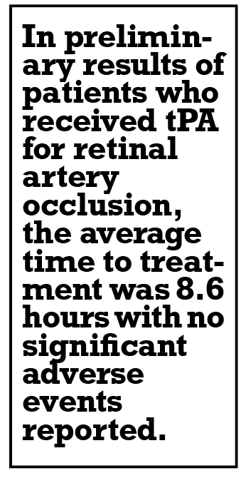 In the preliminary results of five patients who received tPA, the average time to treatment was 8.6 hours (range: 6.5 to 11.75 hours). Visual gains were measured within 24 hours of treatment and all patients showed improvement in visual acuity. Interestingly, two patients lost vision again within two days of treatment, presumably from secondary emboli or thrombosis. In one, antiplatelet therapy reversed the vision loss. No significant adverse events were reported in patients who received tPA.