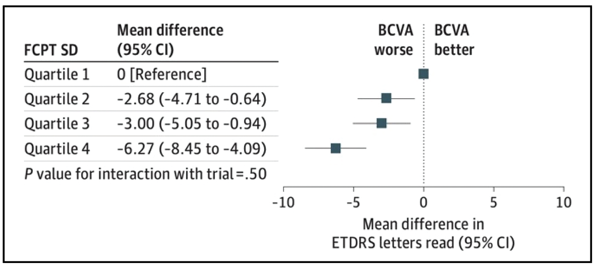 BCVA worsened significantly with increasing quartiles, with approximately 6 letters lost between the first and fourth quartile (-6.27 letters, confidence interval [CI] -8.45 to -4.09). No differences were observed in FCPT SD and BCVA between treatment regimens for both monthly and PRN treatments.