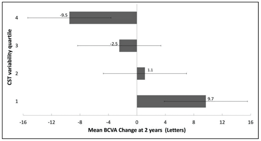 | Figure 2. A retrospective cohort real-world analysis documented mean best-corrected visual acuity change at two years for central subfoveal thickness variability among quartiles (error bars represent 95% confidence intervals). (Reproduced under Creative Commons License from Lai TY, Lai RY. J Personal Med. 2021;11:1024.) |
