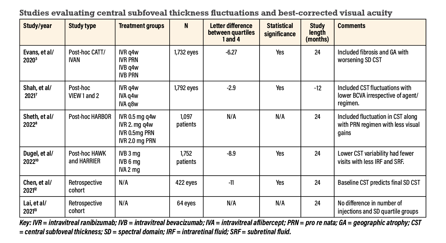 Absolute CST has been explored as a potential surrogate for total macular thickness, but it showed poor correlation with BCVA.1,2 More recently, several studies have looked at CST fluctuations and their impact on BCVA over time in patients treated with anti-VEGF injections in nAMD. Here, we review clinical trial data and real-world practices that have studied CST fluctuations and their correlation with BCVA.