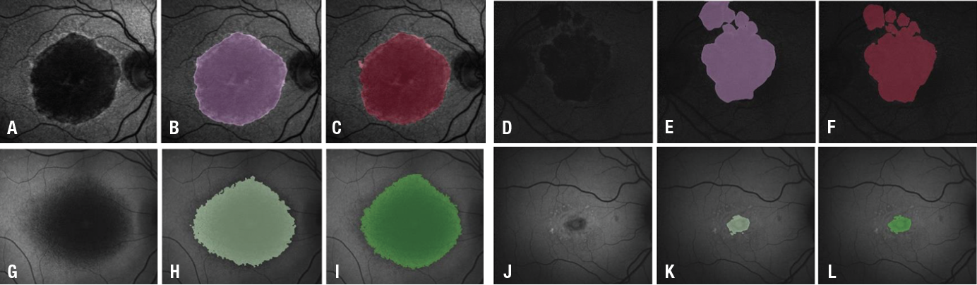 Figure 1: An illustration of segmentation system results. The upper row shows atrophic age-related macular degeneration segmentation: A and D fundus autofluorescence; B and E U-net segmentation; and C and F manual delineation. The lower row shows atrophic juvenile macular degeneration segmentation: G and J FAF images; H and K U-net segmentation; and I and L manual delineation. (Source: Proc. SPIE 10950, Medical Imaging 2019: Computer-Aided Diagnosis, 109501Q [13 March 2019; open source]). |