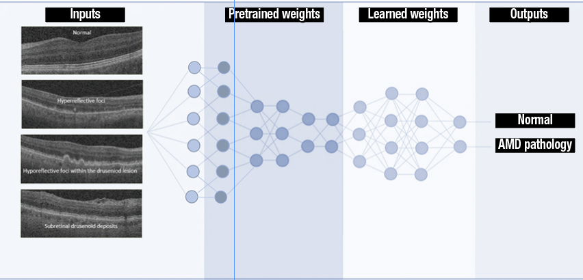 | Figure 2: Deep learning for identifying the presence of early age-related macular degeneration biomarkers employs transfer learning, with which state-of-the-art classification performance is achieved with relatively small datasets by using pretrained models to initiate network parameters, which are then fine-tuned by training on the desired image dataset. Neuron connections shown here are for illustration only. (Source: Sci Rep. 2019;9:10990 [open access]). |