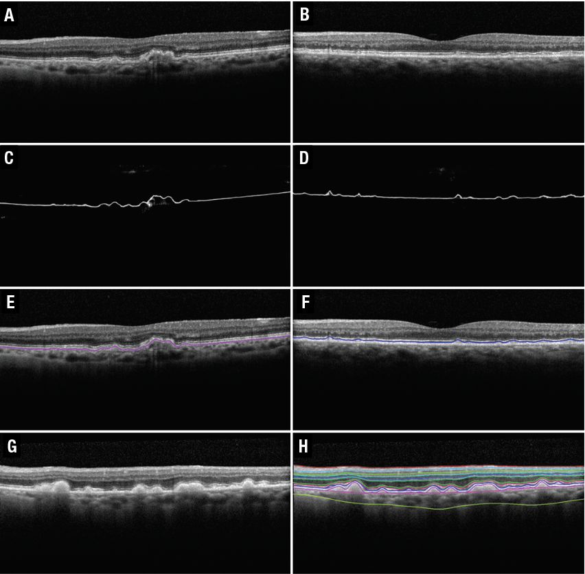 | Figure 3: Segmentation of regular drusen, reticular psuedodrusen (RPD), and 11 retinal layers on spectral-domain optical coherence tomography B-scans. A and B) Original B-scans for the segmentations of regular drusen and RPD shown in E and F, respectively. The drusen segmentation shown in E arises from the deep learning probability map shown in C. The RPD segmentation shown in F arises from the deep-learning probability map shown in D and G) Original B-scan for the 11 retinal-layer segmentation shown in H. (Source: Sci Rep. 2020;10:9541 [open access]) |