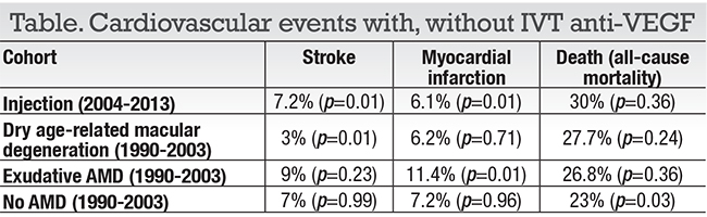 The study included 504 patients who had at least one anti-VEGF injection for e-AMD from 2004 through 2013 and matched to three cohorts from 13 previous years, when anti-VEGF treatments were not available: with e-AMD; with dry AMD; and controls with no history of AMD (Table). Most patients in the anti-VEGF group (n=377, 75 percent) received bevacizumab (Avastin, Roche/Genentech), and 292 patients received at least three IVT injections in the last year before having a CV event.